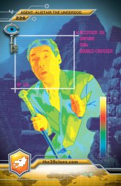 Alistair is depicted on many cards including Card 34, Alistair Oh, Card 102, The Clue-Craft 3000 , which he designed. Alistair is also on Card 168, Bae Oh, where there is a letter about him and 224, The Double Crosser. Three other cards feature him - 226, Alistair The Underdog, 96, Sombrero Alistair and 227, Gordon Oh, which has a coded message from Alistair on a photo. Alistair's Cane is also depicted on Card 174, Alistair Oh's Cane.