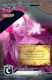 "Her husband, John Adams, may have been the second president of the United States, but it was Abigail Adams who belonged to the most powerful family in the world. Abigail was an early advocate of women's rights and the abolition of slavery. But her deep commitment to social issues didn't keep her from Clue hunting. She and friend Thomas Jefferson often shared information, but when Jefferson made a huge discovery in Paris, he kept it a secret. Did Jefferson betray Abigail? Or was he worried that she wasn't exactly what she seemed? Collect all cards in this combination to unlock a Clue!"