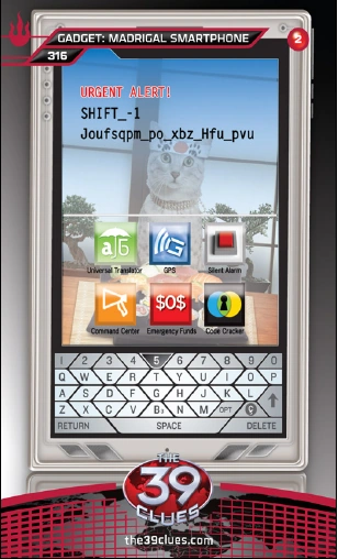 "The Cahill command center in Attleboro, Massachusetts, does an amazing job monitoring Vesper activity around the world. Yet their spy skills are only useful if they can share their intelligence with Cahills in the field. That's why they developed a special Madrigal Smartphone to help agents like you carry out secret missions. It has standard features, like GPS, and more unique applications, like a code cracker. There's also a language translator for analyzing evidence everywhere from Iceland to Malaysia!"